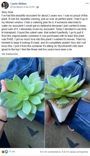 «Hoy decidí que era hora de trasplantarla, encontré la maceta más bonita, le quedaba perfectamente. Voy a sacarla del contenedor de plástico original con el que la compré y vi que la planta era falsa. ¡Puse tanto amor en esta planta! ¡Y es completamente plástico!¿Cómo no sabía esto?», desveló.