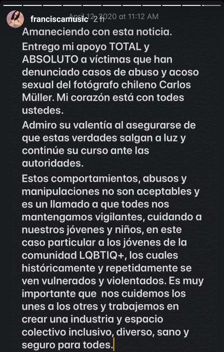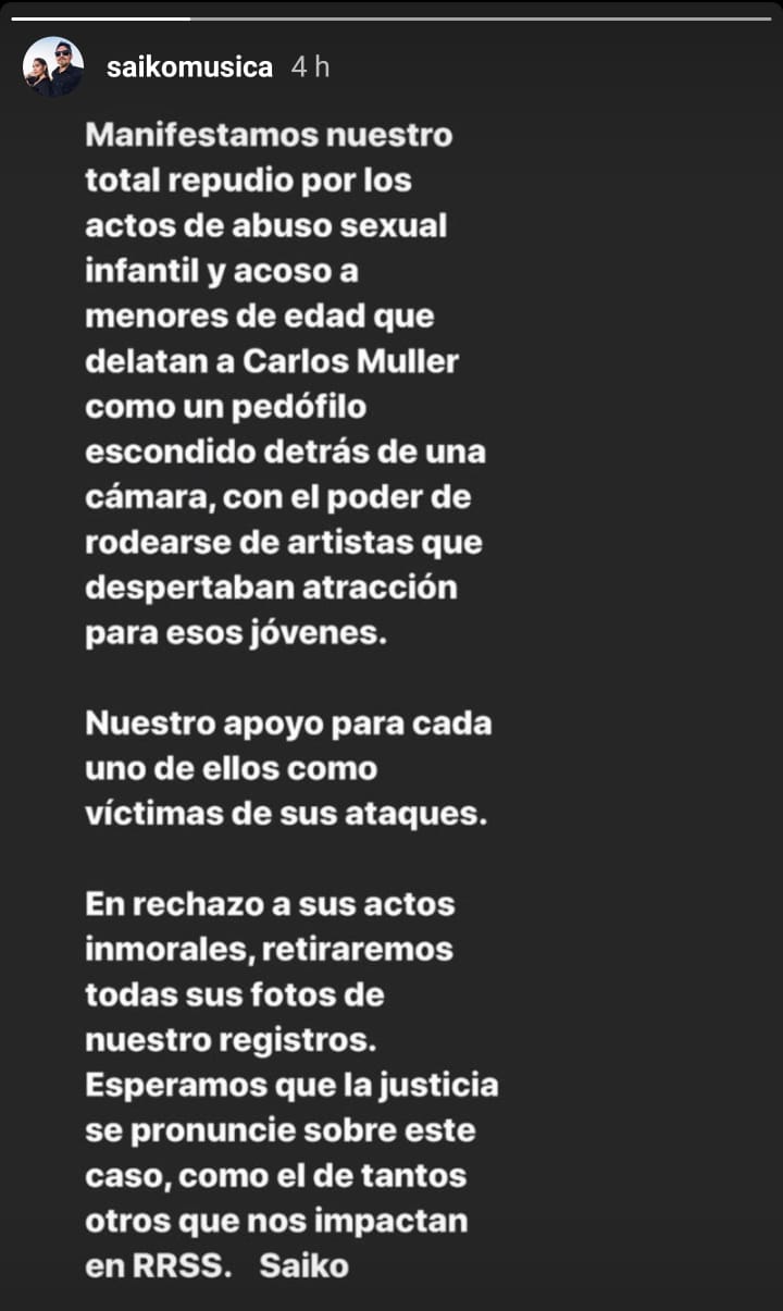 Uno de ellos es Gepe, quien señaló en sus redes que “Entrego mi apoyo absoluto a las víctimas… En gran parte menores de edad sobre los que ejerció acoso y abuso sexual. Müller trabajó en varias ocasiones registrando mis conciertos”.