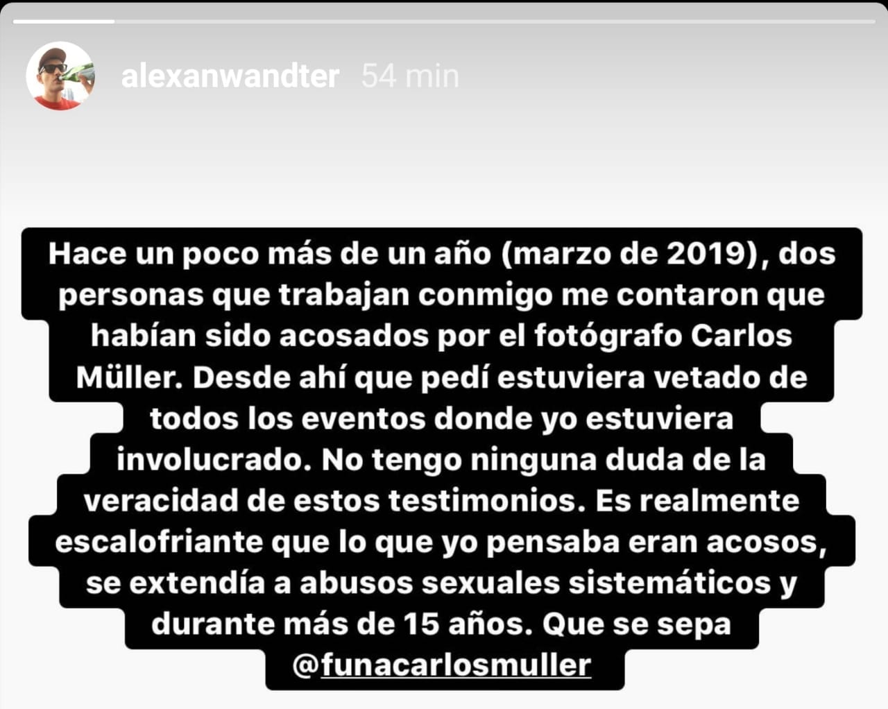 Alex Anwandter, en tanto, condenó de manera más severa a Carlos Müller, revelando que hace algún tiempo “sos personas que trabajan conmigo me contaron que habían sido acosados por el fotógrafo… Desde ahí que pedí que estuviera vetado de todos los eventos donde yo estuviera involucrado“.