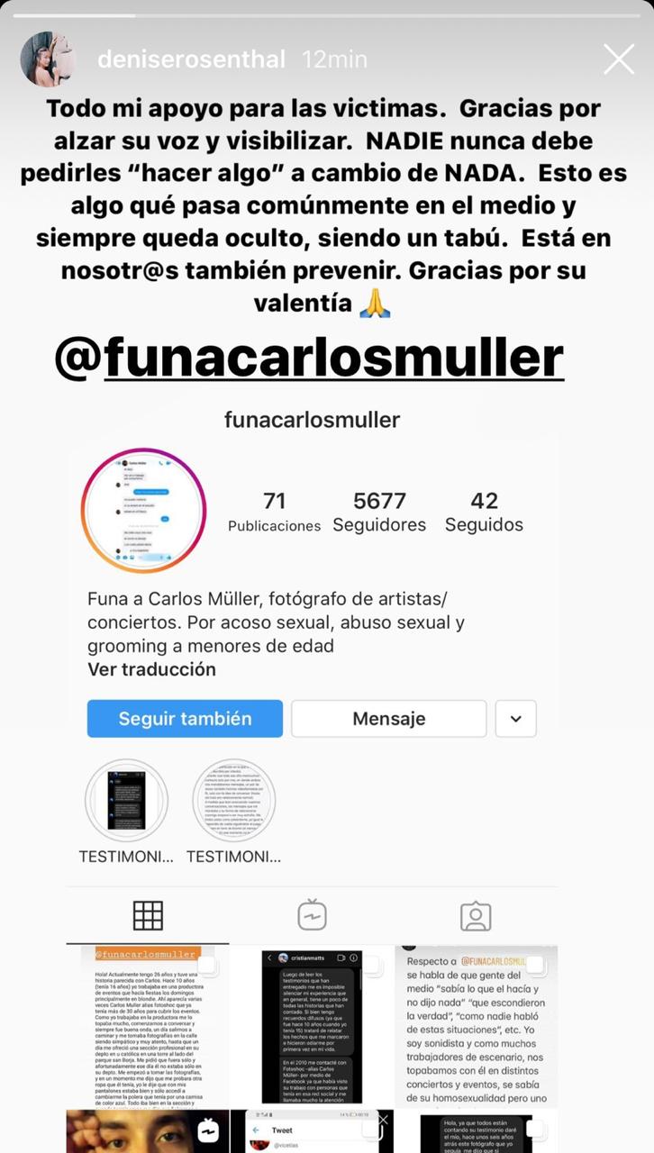 El humorista Edo Caroe también condenó la situación, escribiendo en sus Instagram Stories que “él trabajó registrando algunos de mis proyectos, y si bien uno no tiene como chucha prever este tipo de actos despreciables, si tengo el deber moral de condenarlos ahora que estoy en conocimiento. Las víctimas son numerosas y de forma valiente han sacado esto a la luz para que no quede impune”.