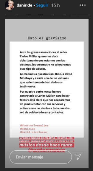 Los músicos nacionales Dani Ride y Francisco Victoria figuran entre los denunciantes, quienes a través de sus redes sociales compartieron la experiencia que tuvieron con Müller.
