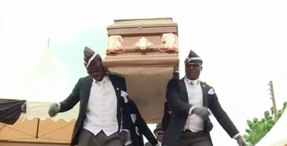 ¿Cuál es el origen del video del «meme del ataúd»? Corresponde a un reportaje hecho en 2017 por la BBC a los Dancing Pallbearers, cuyos servicios son usados en los funerales de Ghana donde se realizan festividades para celebrar la vida del difunto. Ahora, el clip se utiliza después de un fail o chascarro.