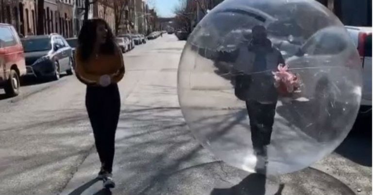 Unos días más tarde, llegaría una segunda cita en la que Jeremy y Tori se sintieron más cerca. Eso sí, respetando la distancia social. Para ello, el fotógrafo se introdujo en una burbuja de plástico y acudió a buscar a Tori y así pasear juntos por las calles de Nueva York.