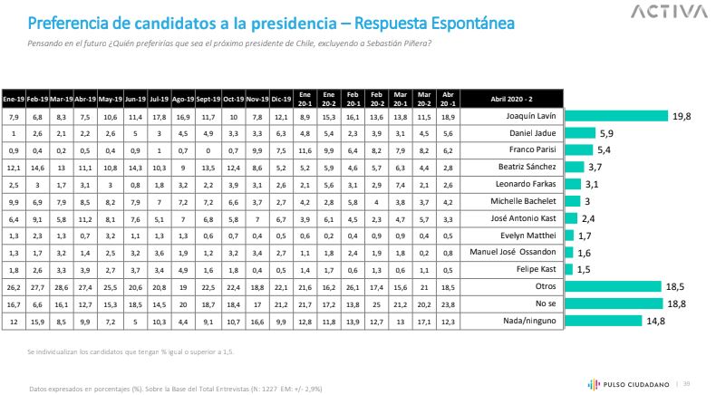 Un nueva encuesta Pulso Ciudadano de Activa Research preguntó (como es habitual) sobre los posibles candidatos presidenciales.Y nuevamente Joaquín Lavín
