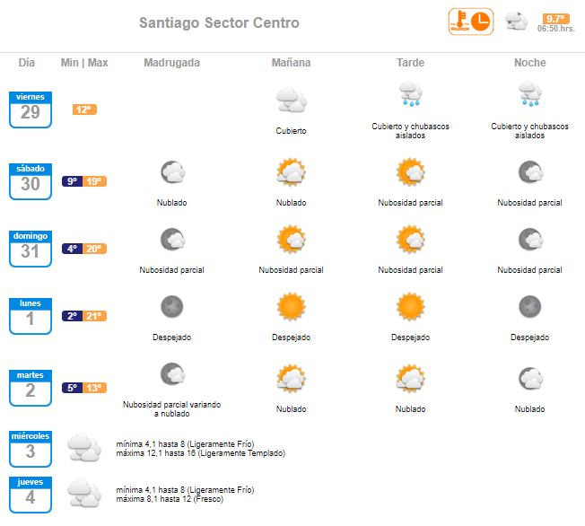 Esta jornada comenzó con 9°C en Santiago mientras que en la tarde la temperatura llegará hasta solo los 12°C, bajo un cielo cubierto y con chubascos.