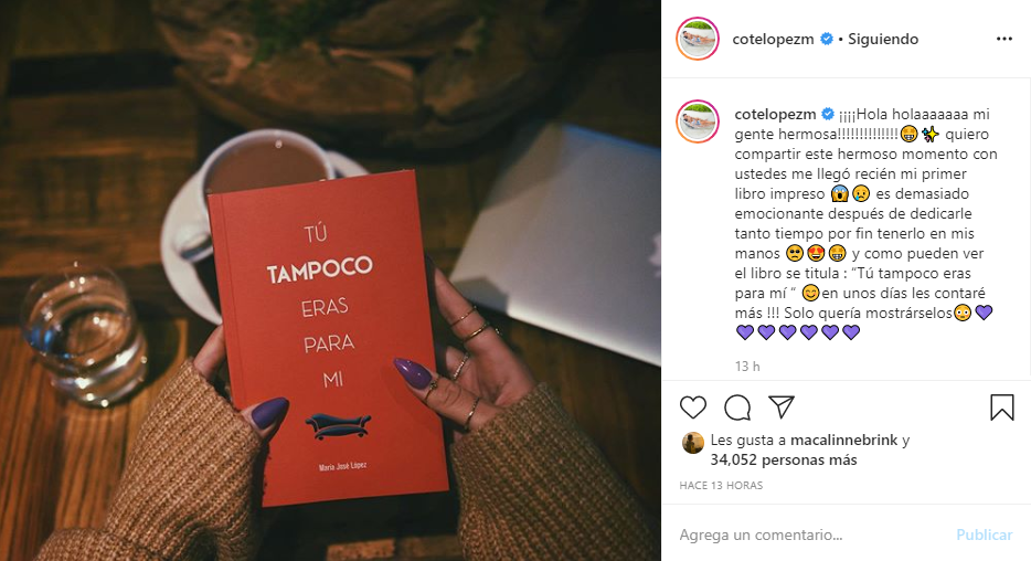 “¡¡¡Hola holaaaaaaa, mi gente hermosa!!! Quiero compartir este hermoso momento con ustedes. Me llegó recién mi primer libro impreso. Es demasiado emocionante, después de dedicarle tanto tiempo, por fin tenerlo en mis manos y como pueden ver el libro se titula ‘Tú tampoco eras para mí’ ¡¡En unos días les contaré más!! Solo quería mostrárselos”, escribió Coté López junto a la publicación.