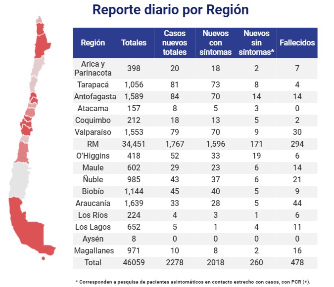 En ello, según los números entregados la Región Metropolitana, la Araucanía, Antofagasta y Valparaíso son los lugares con más casos confirmados en total con 34.451, 1.639, 1589 y 1.553 respectivamente.