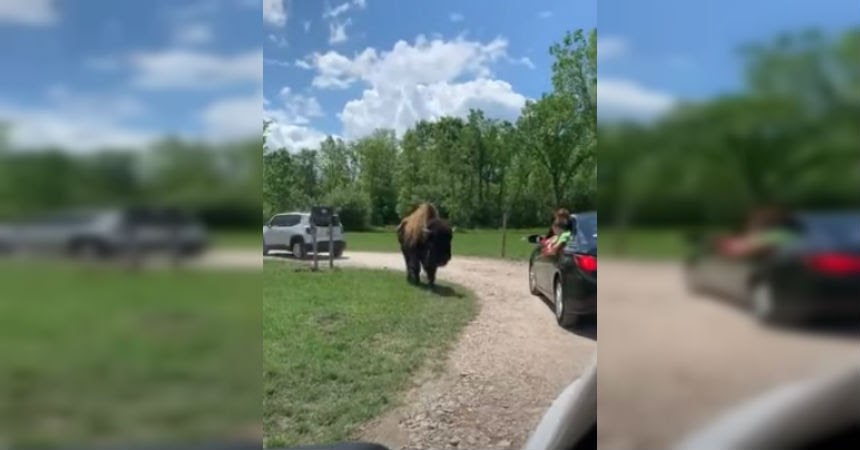 Es la advertencia que no siguió este grupo de turistas, que creyeron estar a salvo a la hora de interactuar con un enorme bisonte, con las ventanillas de su automóvil abiertas, y por poco no se fueron con alguna que otra abolladura.