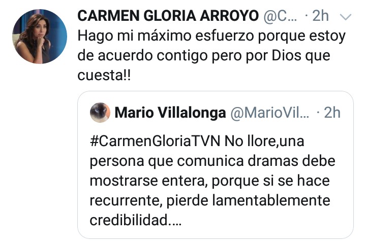 Carmen Gloria Arroyo responde a tuitero que la criticó por llorar en su programa