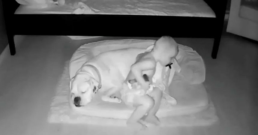En el video se puede ver al bebé todavía en pañales y con chupete bajándose de su cama y cogiendo su sábana para dormir junto al perro bóxer que descansa a su lado.