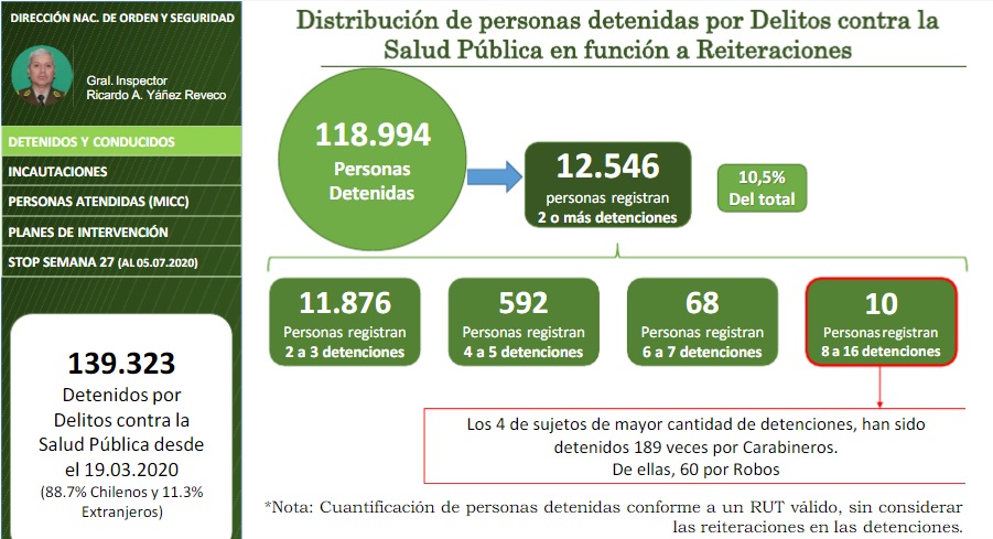 Recientemente Carabineros de Chile entregó un balance de las detenciones realizadas durante los más de 100 días de pandemia en nuestro país. Entre ellas