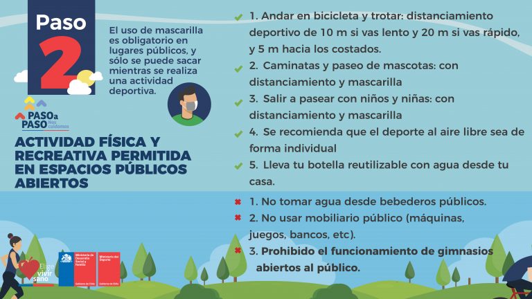 Eso sí, siguiendo las recomendaciones de autocuidado, que son el distanciamiento físico y el uso obligatorio de mascarilla. Ello, salvo cuando se realice práctica deportiva, como trotar o andar en bicicleta.