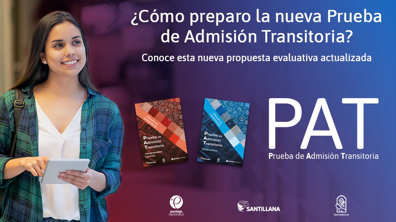 Santillana, Puntaje Nacional y Ediciones UC presenta la única propuesta actualizada y disponible para que las y los jóvenes que rendirán la nueva Prueba de Admisión Transitoria la lleven a cabo con la tranquilidad de haberse preparado en los temas en que serán examinados este año. Se trata de dos manuales de alta calidad y rigor, 100 % alineados con los temas de la PAT; una plataforma que se vincula con los contenidos y actividades desarrollados en los materiales impresos y que ofrece videos y ensayos en formato digital, y el respaldo académico que una propuesta integral como esta requiere.