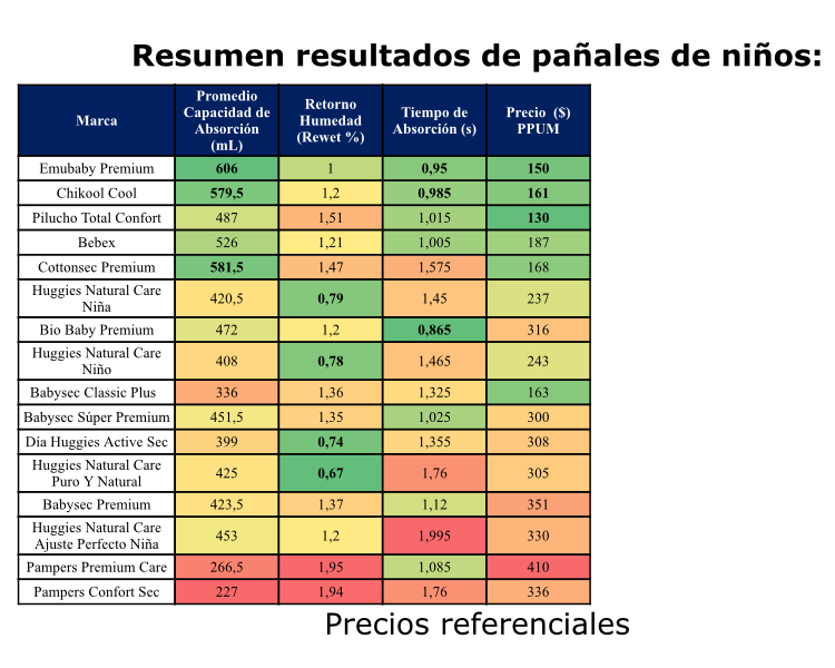 Los más absorbentes: Los productos con mayor capacidad de absorción fueron ‘Emubaby Premium’ (606 mL) y ‘Cottonsec Premium’ (581,5 mL).