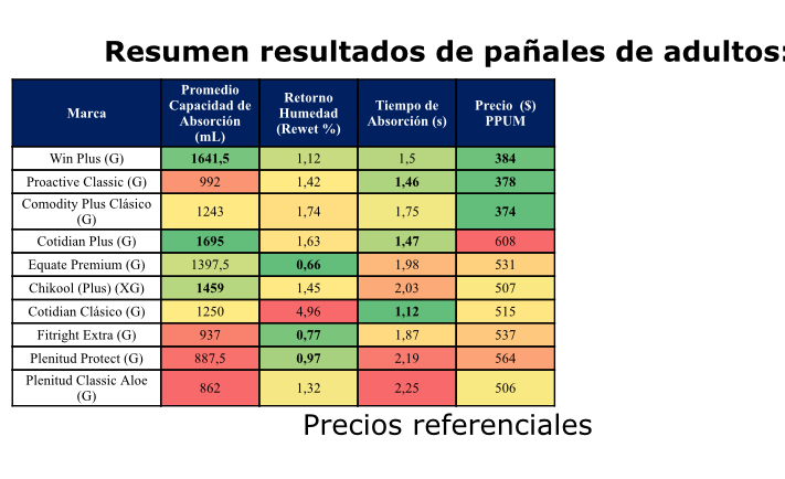 -En los pañales para adultos, la mejor relación desempeño y precio fue para los pañales mejor Win Plus (G), Proactive Classic (G) y Comodity Plus Clásico (G).