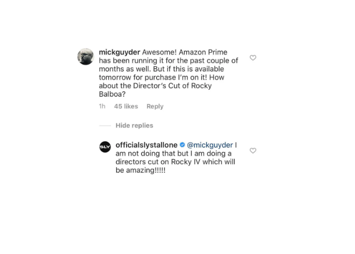Así es ya que el artista fue consultado en Instagram sobre la posibilidad de un director’s cut de «Rocky Balboa», la sexta entrega, y dijo que no está en sus planes. Pero eso sí sorprendió con su posterior respuesta.