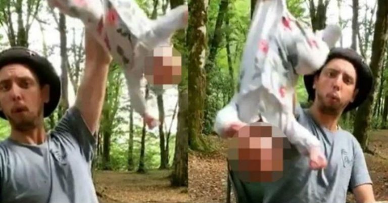 Como se puede ver en las imágenes, el joven silba felizmente mirando a la cámara mientras balancea en el aire a la pequeña, a la que únicamente sujeta por una pierna, recoge ABC.