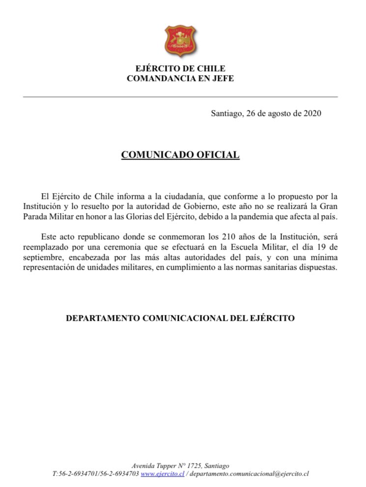 Lego de distintas evaluaciones, esta jornada el Ejército de Chile informó a través de un comunicado que este 2020 no se realizará la Parada Militar en el Parque O’Higgins, que se conmemora cada 19 de septiembre.