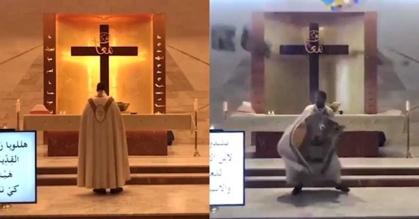 En las imágenes se puede apreciar que la luz eléctrica se interrumpe y segundos después comienzan a caer escombros. El sacerdote, del que no se ha dado su nombre, intenta escapar pero parece caer al suelo golpeado por un trozo de concreto.