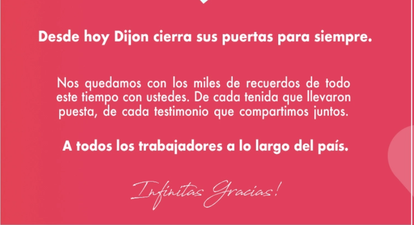 La cadena de tiendas de ropa Dijon anunció recientemente el cierre definitivo de sus sucursales.A través de un breve mensaje en su sitio