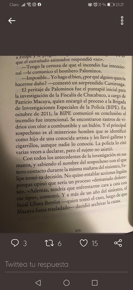 «El principal sospechoso es el misterioso hombre que se identificó como hijo de una conocida artista y les llevó galletas y cigarrillos, aunque nadie lo conocía», señala la autora en el libro sobre el incendio ocurrido en 2011.