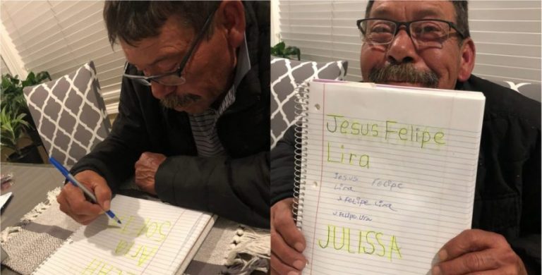 Sobre esto, su sobrina comentó que “mi tío no tuvo la oportunidad de ir a la escuela, así que le estoy enseñando a escribir, y escribió los nombres de sus nietos por primera vez“.