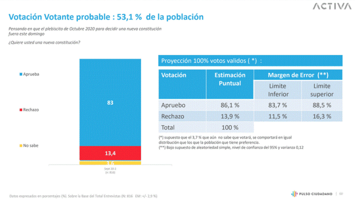 Según indica la mecición, ante la pregunta ‘Pensando en que el plebiscito de Octubre 2020 para decidir una nueva constitución fuera este domingo ¿Quiere usted una nueva constitución?’, el 83% se manifestó por la opción de tener una nueva carta fundamental, mientras que el 13,4% optó por el «Rechazo».