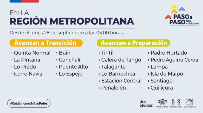 Asimismo, avanzan a Transición las comunas de Quinta Normal, La Pintana, Lo Prado, Cerro Navia, Buin, Conchalí, Puente Alto y Lo Espejo.