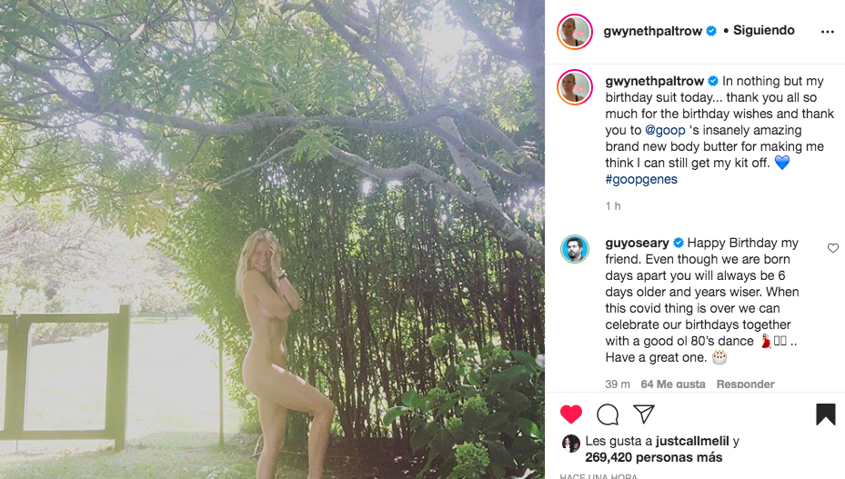 Este domingo la actriz Gwyneth Paltrow sorprendió a sus seguidores con una fotito sin ropa. Y es que cumplió 48 años y quiso celebrarlo de una manera diferente.