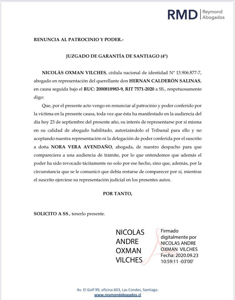 Este miércoles, ante el 4º Juzgado de Garantía de Santiago, el defensor Nicolás Oxman presentó su renuncia a representar a Calderón Salinas, ya que éste “ha manifestado en la audiencia del día hoy 23 de septiembre del presente año, su interés de representarse por sí misma (como víctima) en su calidad de abogado habilitado”.