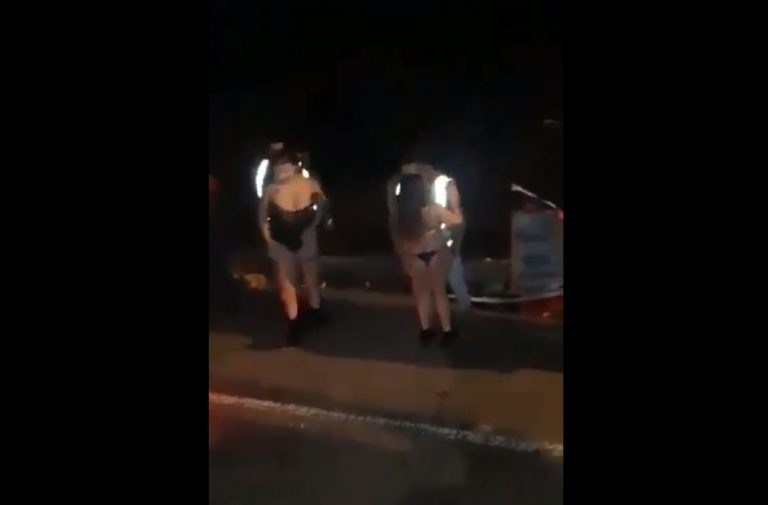En el registro que se ha viralizado en redes sociales se puede ver a un grupo de trabajadores baliando, de noche, junto a dos mujeres en ropa interior, en una carretera.