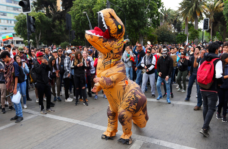 “Corre Dinosaurio”, conocido por su participación en las manifestaciones del estallido social, volvió a aparecer con su clásico disfraz
