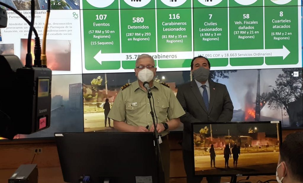 Un fallecido, y un total de 580 detenidos en 107 eventos a nivel nacional, de los cuales 57 se produjeron en la Región Metropolitana, es el parte del reporte entregado este lunes por Carabineros y el subsecretario del Interior, Juan Francisco Galli.