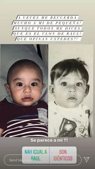 «¡A veces me recuerda mucho a mí de pequeña! ¡Aunque todos me dicen que es el clon de Raúl! ¿Qué opinan ustedes?», escribió en sus historias de Instagram, sumando una encuesta. «¿Se parece a mi?», preguntó, recibiendo por una pequeña mayoría comentarios afirmativos.