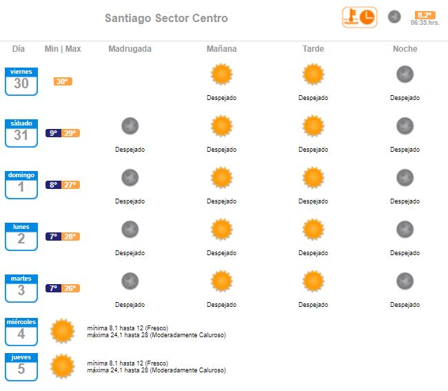 Este viernes 30 de octubre partió con 8°C, mientras que en la tarde la temperatura llegará hasta los 30°C, bajo un cielo despejado.Según info