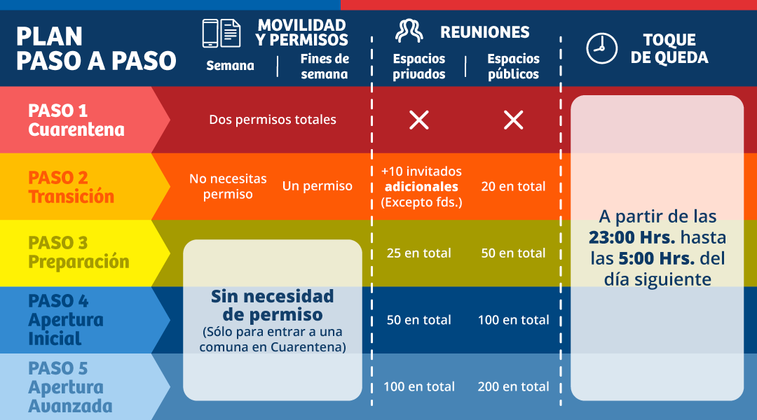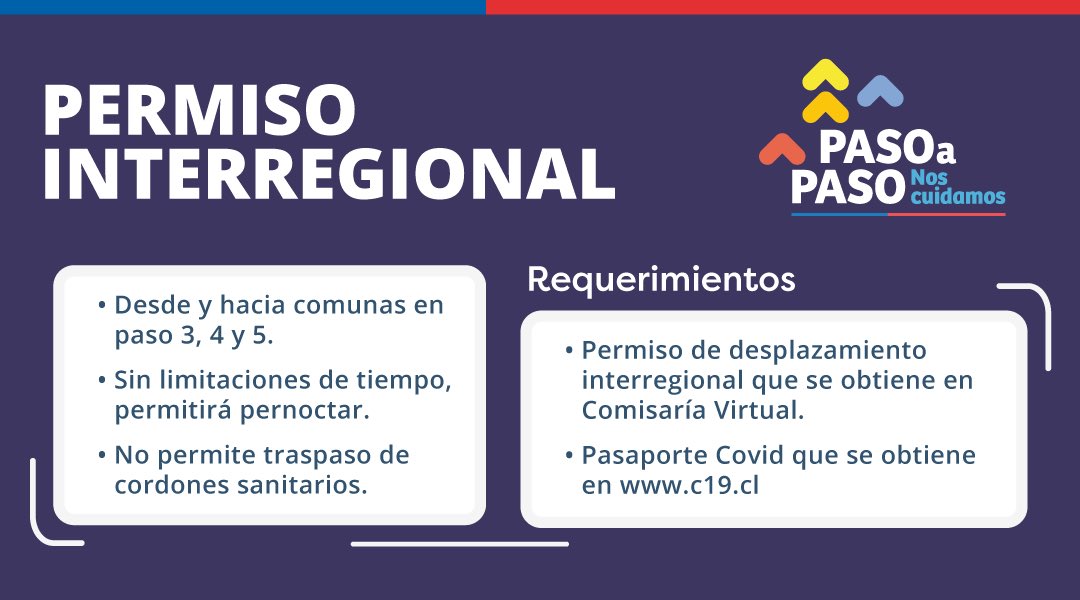 En tanto, el permiso de desplazamiento sólo permite el traslado ida y vuelta, desde y hacia comunas que se encuentren en los pasos de Preparación (3), Apertura Inicial (4) y Apertura Avanzada (5). No hay límite de tiempo de estadía y se puede pernoctar en el destino, incluyendo los hoteles.