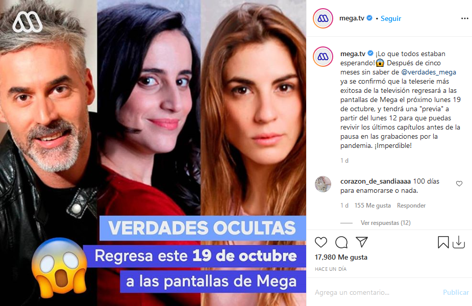 «¡Lo que todos estaban esperando!😱 Después de cinco meses sin saber de @verdades_mega ya se confirmó que la teleserie más exitosa de la televisión regresará a las pantallas de Mega el próximo lunes 19 de octubre, y tendrá una «previa» a partir del lunes 12 para que puedas revivir los últimos capítulos antes de la pausa en las grabaciones por la pandemia. ¡Imperdible!», escribieron en la publicación de Instagram.