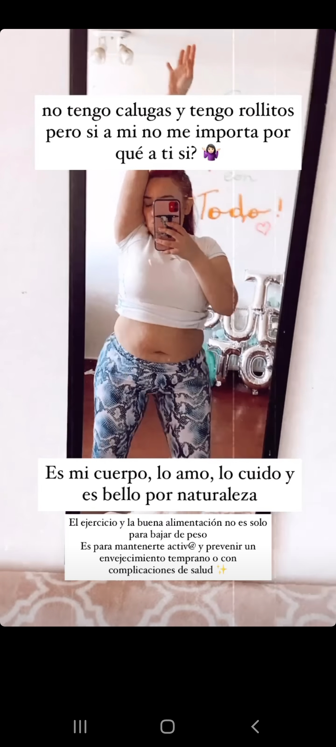 Además publicó una foto mostrando su abdomen y escribió: “No tengo calugas, y tengo rollitos, pero si a mí no me importa, ¿por qué a ti sí“.