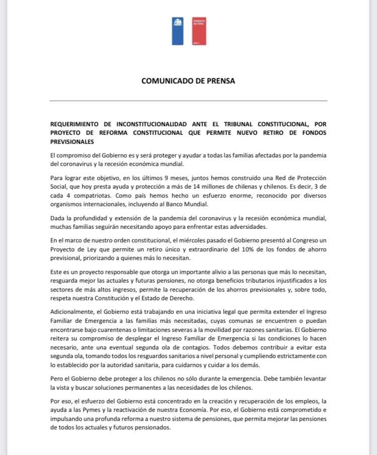 Este domingo el gobierno informó a través de un comunicado de prensa que finalmente ingresó el requerimiento de inconstitucionalidad ante el Tribunal Constitucional (TC) para impedir la aprobación del proyecto de segundo retiro de ahorros desde las Administradoras de Fondos de Pensiones (AFP) que fue tramitado con apoyo transversal en la Cámara de Diputadas y Diputados, y que este miércoles debería pasar a la sala del Senado.
