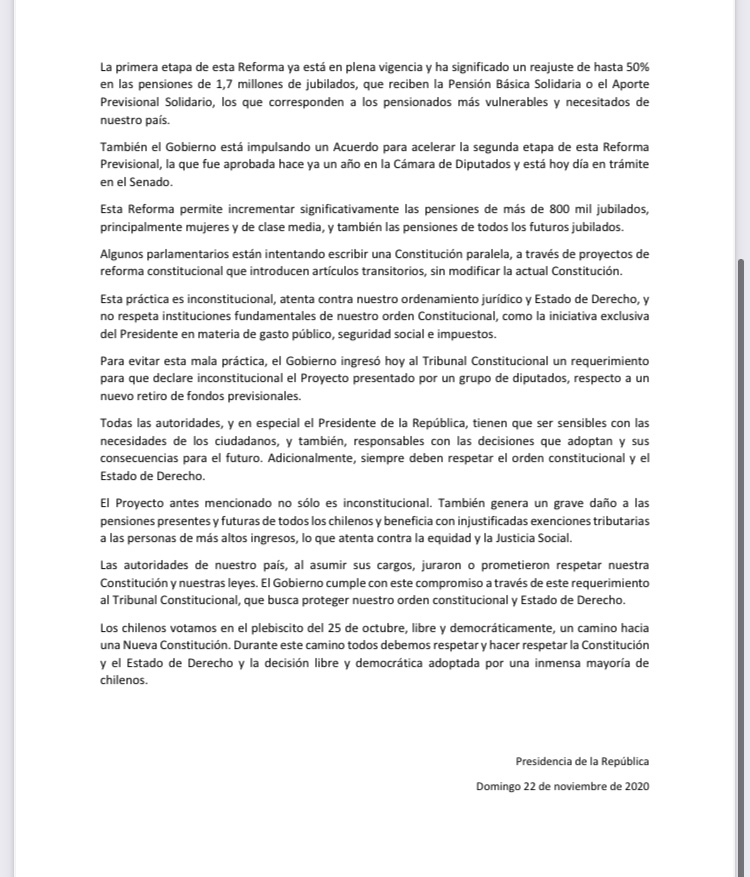 En el comunicado, se reitera además lo que el Mandatario había señalado días antes, apuntando a que algunos parlamentarios “están intentando escribir una Constitución paralela, a través de proyectos de reforma constitucional que introducen artículos transitorios, sin modificar la actual Constitución“.