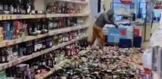 La presentadora de televisión Lee Clark estaba en la tienda y dijo que se rompieron al menos 500 botellas durante el incidente «increíblemente peligroso».