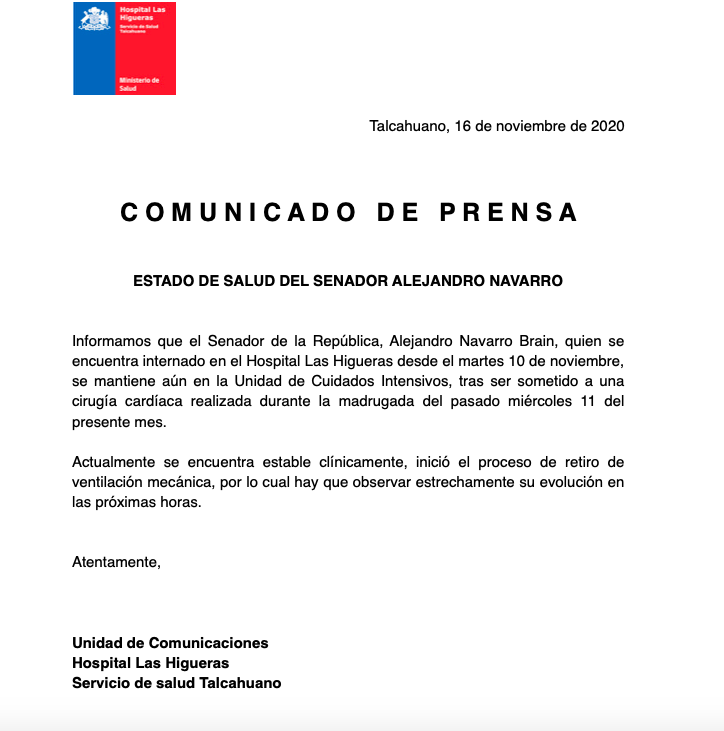 Recientemente se informó que el senador Alejandro Navarro comenzará a salir de ventilación mecánica, luego de haber sido sometido a una operación cardíaca el pasado 11 de noviembre, según el parte médico dado a conocer este lunes por el Hospital Las Higueras de Talcahuano, centro asistencial en el que se encuentra todavía en la unidad de cuidados intensivos.
