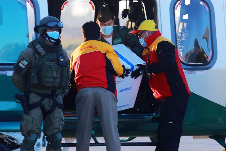 El traslado de las dosis se hace además bajo un estricto operativo de seguridad que incluye a personal de las Fuerzas Armadas, Carabineros y de la Policía de Investigaciones, además del resguardo desde el aire a través de un helicóptero de la policía uniformada.