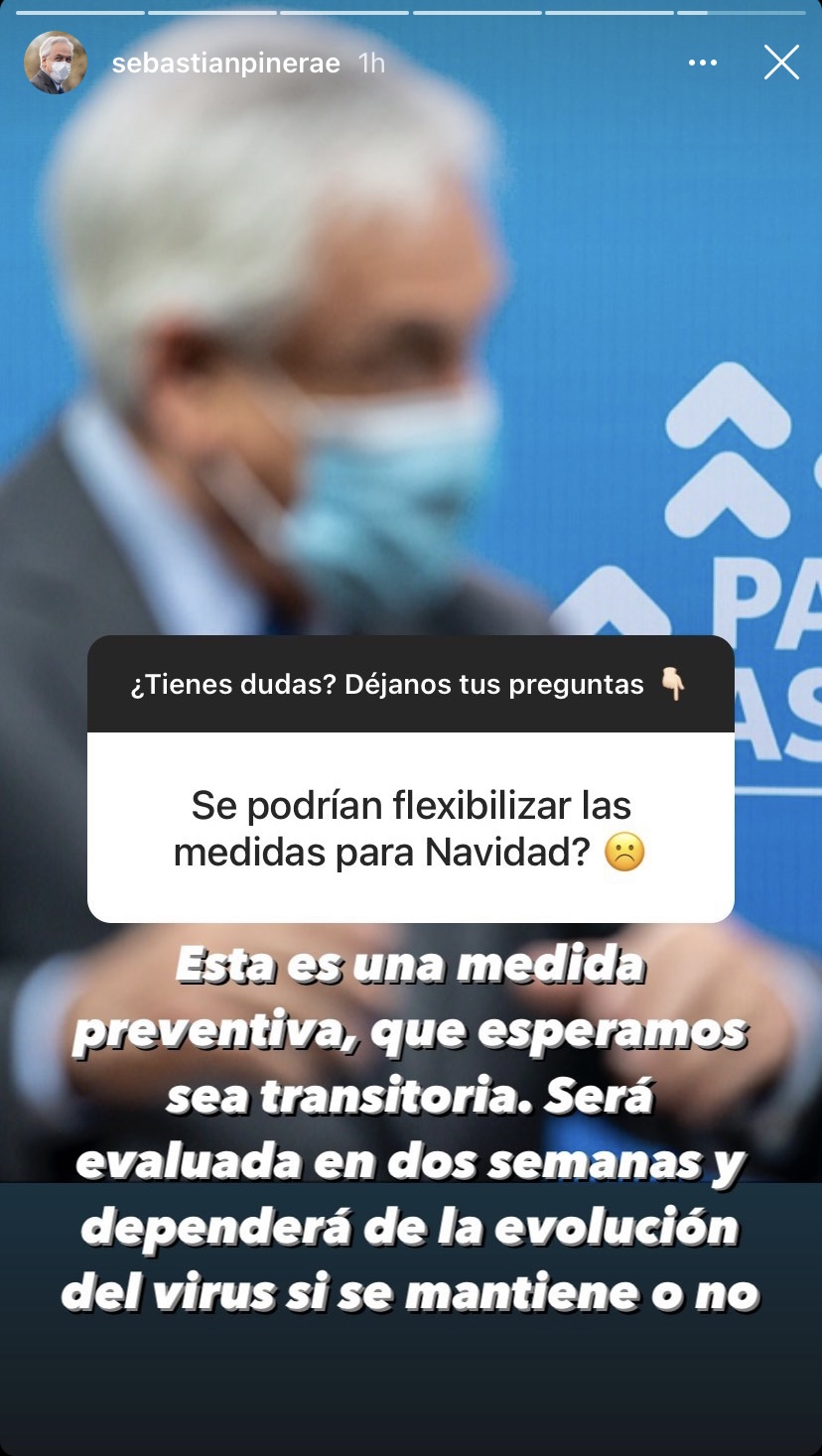 En sus stories de Instagram, el Jefe de Estado abrió una dinámica para responder preguntas sobre el cambio de etapa que tendrá la capital. Consultado sobre cuánto durará, Piñera contestó que “esta es una medida transitoria y preventiva para bajar los contagios y evitar aglomeraciones“.