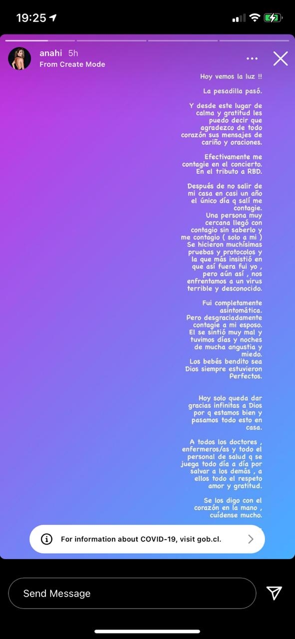 Afortunadamente, ya pasó lo peor para Anahí puesto que en las últimas horas confirmó que estaba libre de Covid-19. De hecho, compartió un pantallazo del examen.