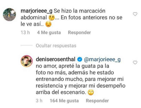 «Esos abs»; «Comparte la rutina de ejercicios»; «Diosa»; «Extremadamente colosal»; «Cómo logras esos abs», son algunos de los comentarios que recibió Denise. No obstante, hubo un mensaje en particular que se robó la atención y que hizo que hasta la misma intérprete respondiera.