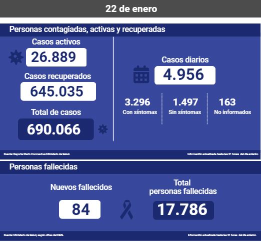 🔸 84 fallecidos (17.786 en total) pic.twitter.com/efgNrAFykc— Ministerio de Salud (@ministeriosalud) January 22, 2021