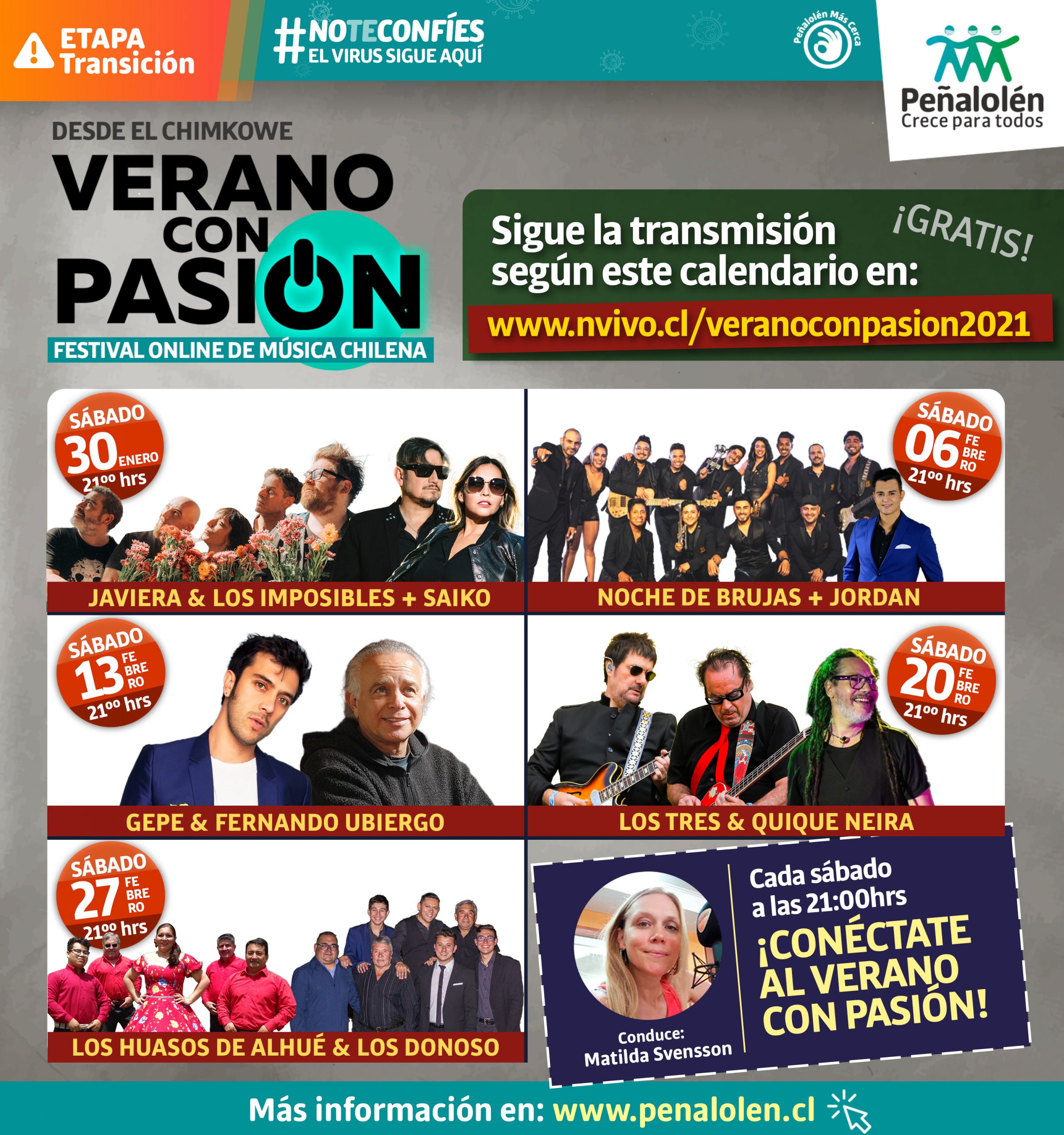 Este sábado 30 de enero, la Municipalidad de Peñalolén comenzará una nueva versión de “Verano con Pasión en Peñalolén”. Las presentaciones serán de los grupos Saiko y Javiera y los Imposibles. El evento tendrá un formato íntimo y acústico. Se transmitirá gratuitamente por streaming.