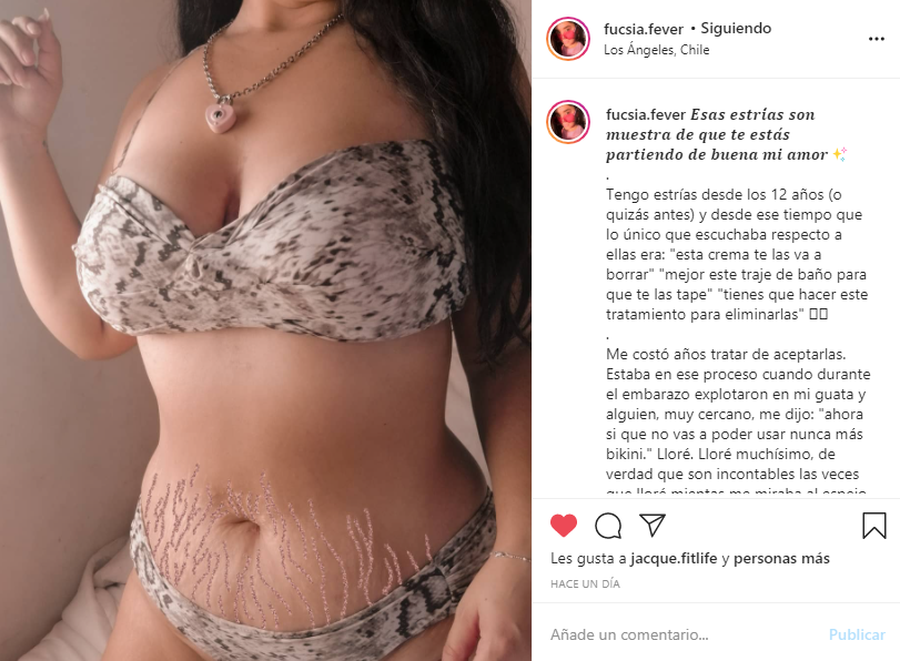 En la imagen la chiquilla oriunda de Los Ángeles (Región del Biobío) muestra sus estrías. “Tengo estrías desde los 12 años (o quizás antes) y desde ese tiempo que lo único que escuchaba respecto a ellas era: ‘esta crema te las va a borrar’, ‘mejor este traje de baño para que te las tape’, ‘tienes que hacer este tratamiento para eliminarlas’”, partió su relato junto a la foto.