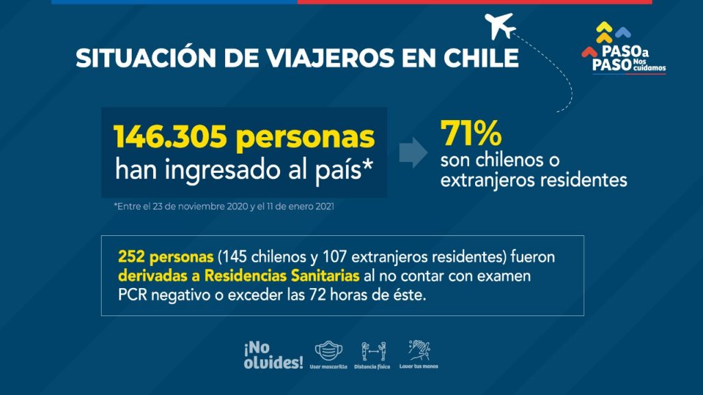 Además Daza explicó que todas las personas (chilenos y extranjeros), para ingresar necesariamente deben presentar un examen PCR negativo en el aeropuerto con una antigüedad máxima de 72 horas. De lo contrario, no sólo serán trasladados a una residencia sanitaria sino que arriesgan una multa de hasta 56 UTM (más de 2,854 millones de pesos).